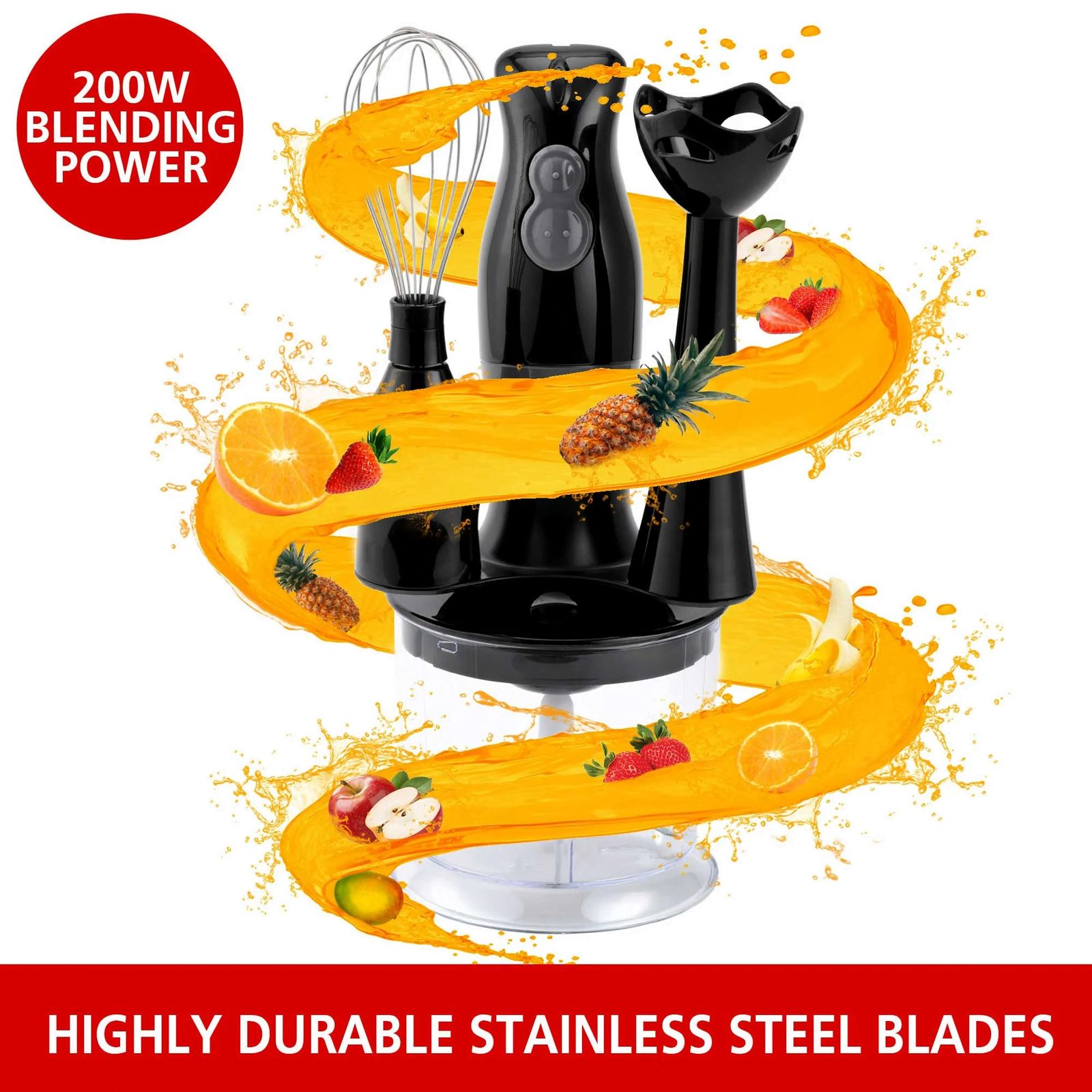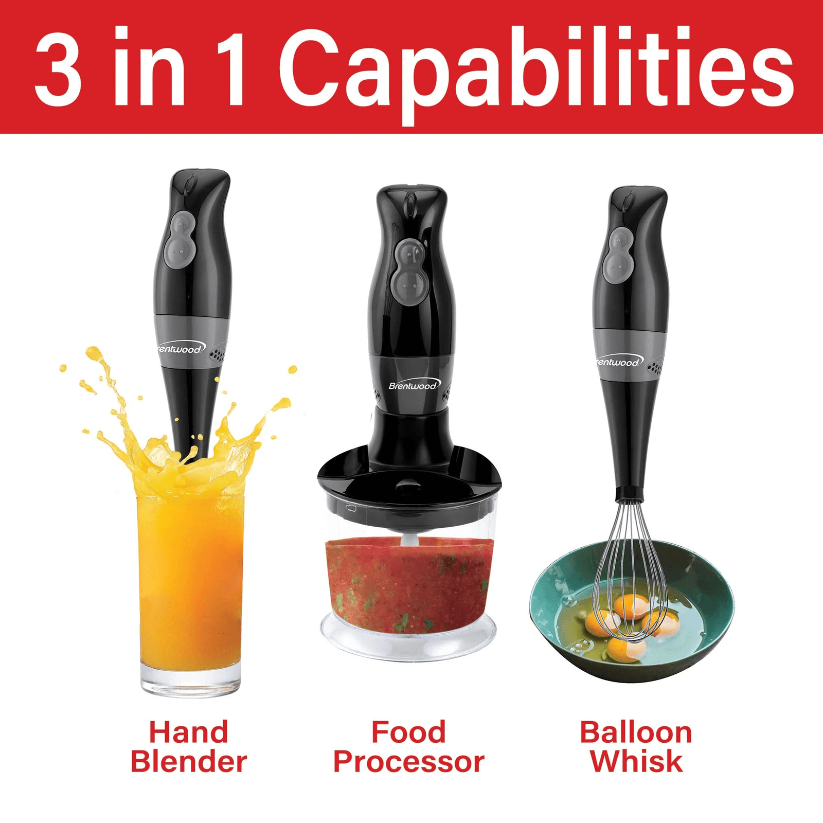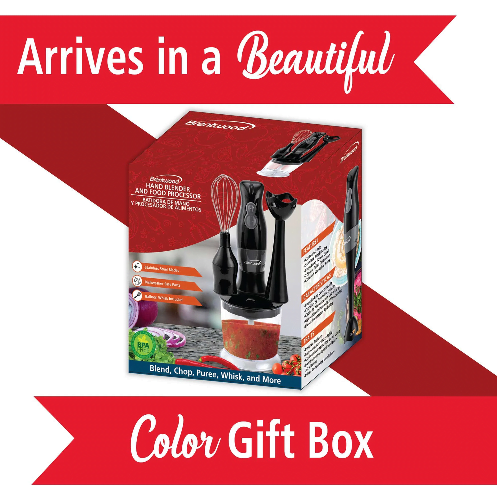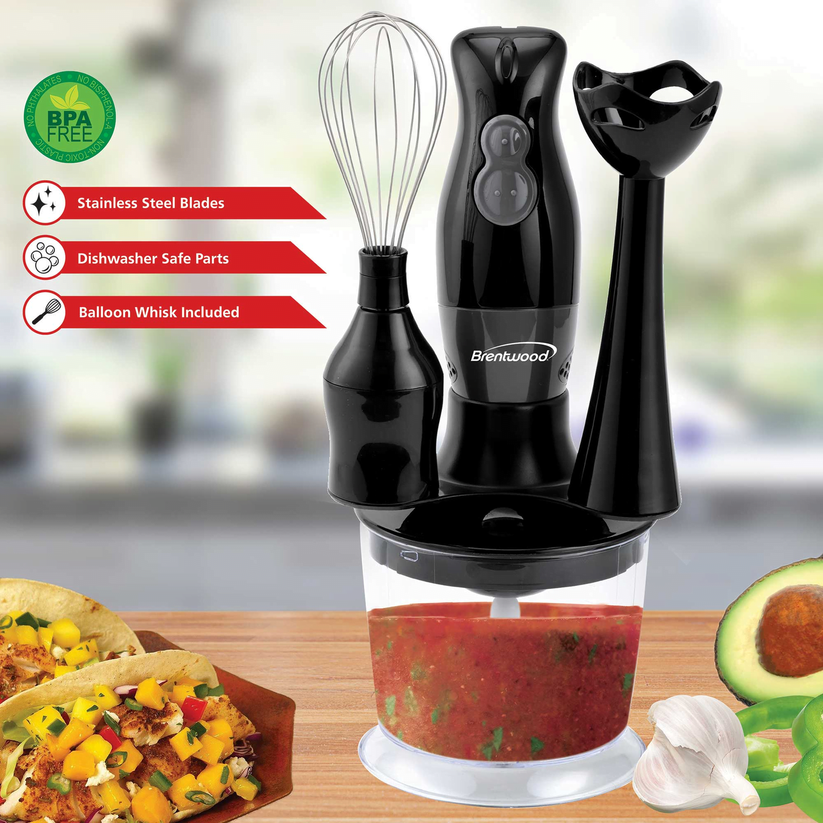 The powerful and ergonomic Brentwood HB-38BK 2 Speed Hand Blender and Food Processor with Balloon Whisk crushes, chops, blends, purees, and mixes. Extra long cord and blend shaft let you freely move and reach into pitchers, pots and bowls. Stacks for easy storage. All removable parts are dishwasher safe.