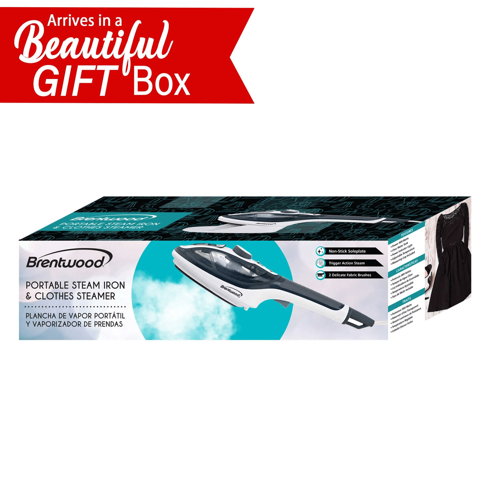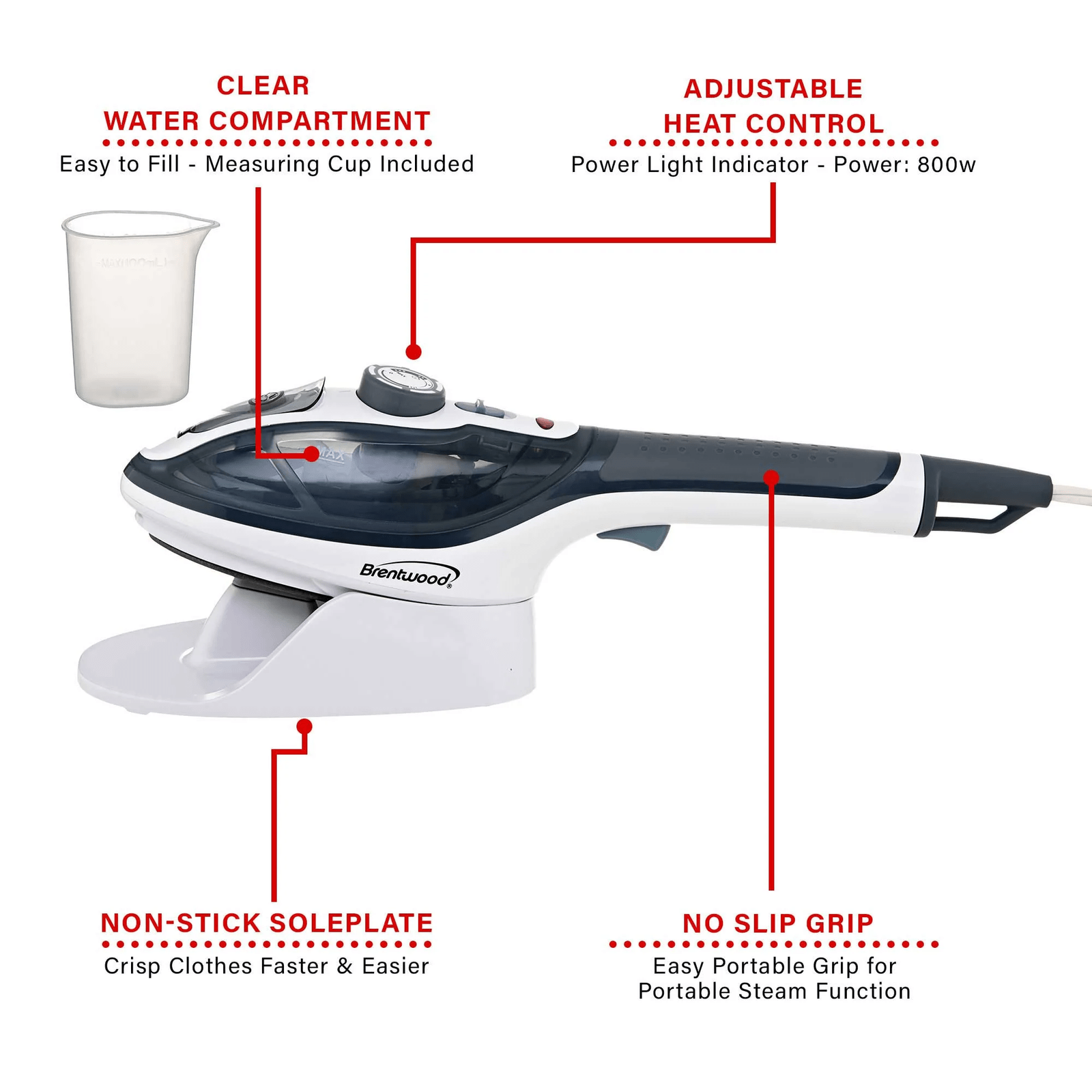 Use the powerful 800w Brentwood MPI-41 Non-Stick Handheld Clothes Steamer and Iron to eliminate wrinkles at home or on the go. Easily remove wrinkles from hanging garments using the powerful burst steam function. Say goodbye to user fatigue using the comfortably placed burst steam trigger. Quickly iron out wrinkles using the fast heating non-stick soleplate. Adjustable temperature and steam accommodates several types of fabrics. The generously sized water tank has an easy access port on the top of unit. A rubberized handle provides you with a secure grip. Enjoy a wide range of motion thanks to an extra long power cord.